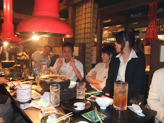 写真:ハイテンションな営業部長の手前であっち向いてる新入社員。。2名。