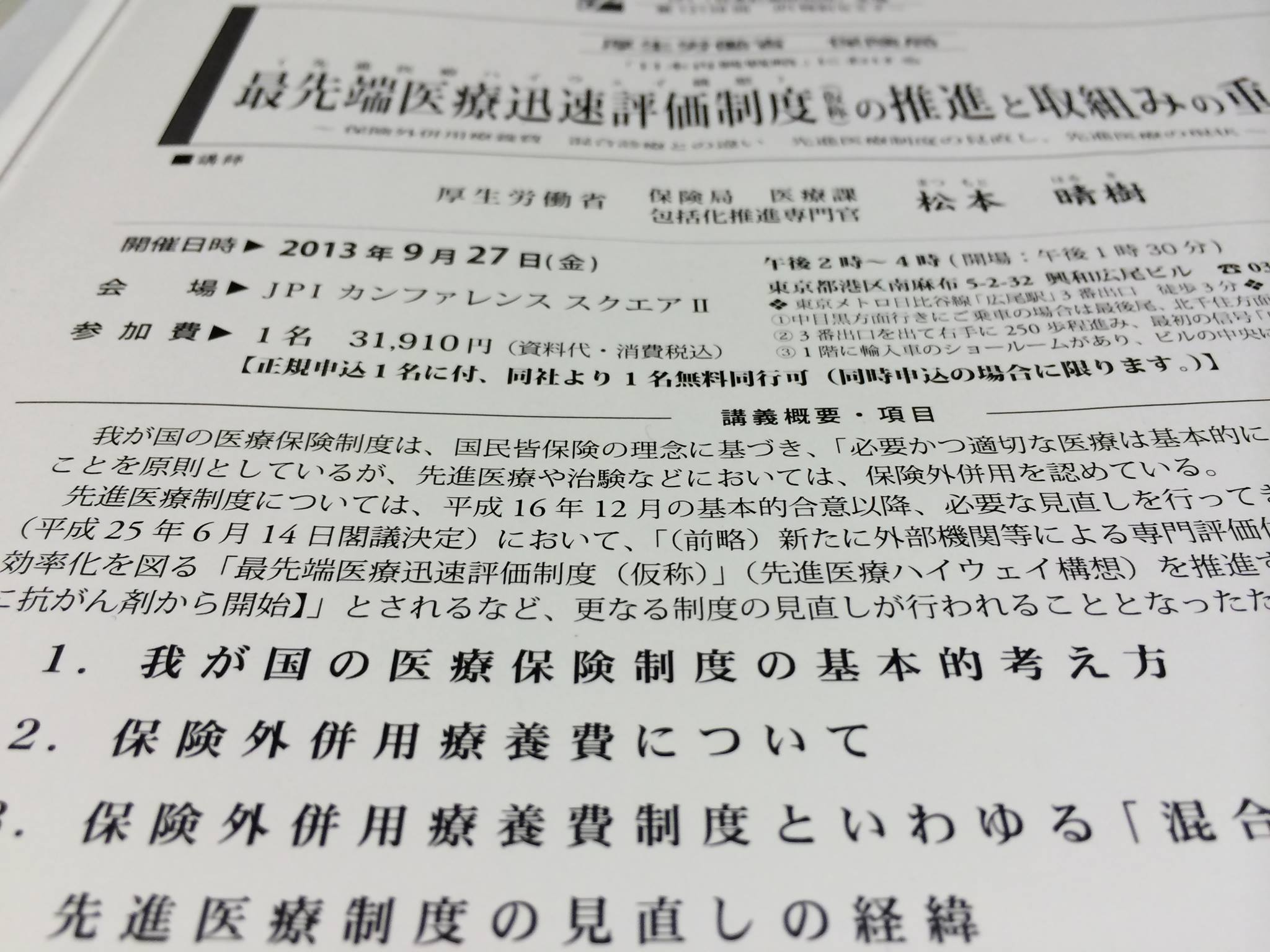 最先端医療迅速評価制度の講習会先週の金曜日 9月27日に最先端医療迅速評価制度の推進と取組の要点を聴きに行ってきました。