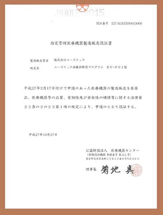 大きな進化を遂げたユーズテック指定管理医療機器製造販売認証書 が届きました。