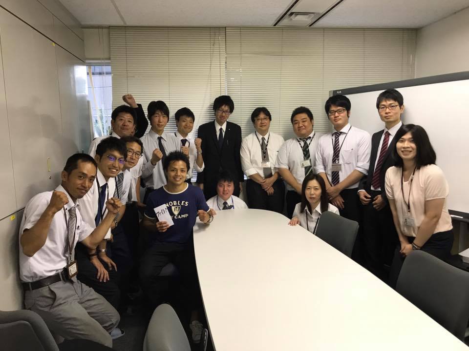 皆でファイティングポーズ!頑張れ久高選手!プロボクサーの久高寛之選手が大阪営業所に挨拶に来てくれました。