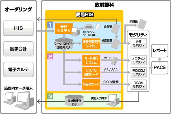 オーダリングシステムとの検査オーダ情報連携を行います。放射線科受付機能をもたない簡易RISの構築が可能です。